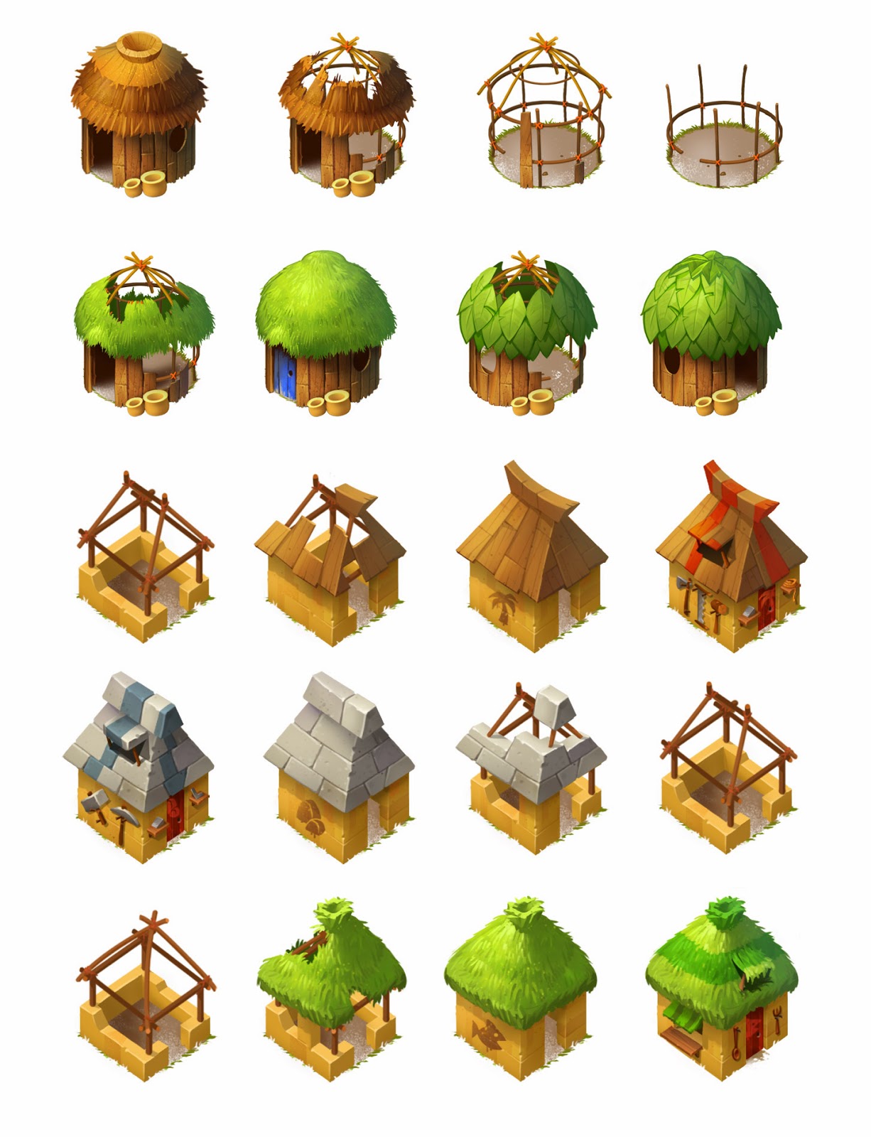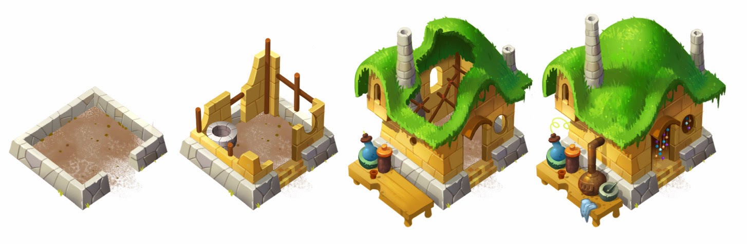 Basically, you have to keep upgrading your huts to give the players something to do. (Hence the ongoing renovations). The little fish on the bottom one tells you that its a storage warehouse for food :D