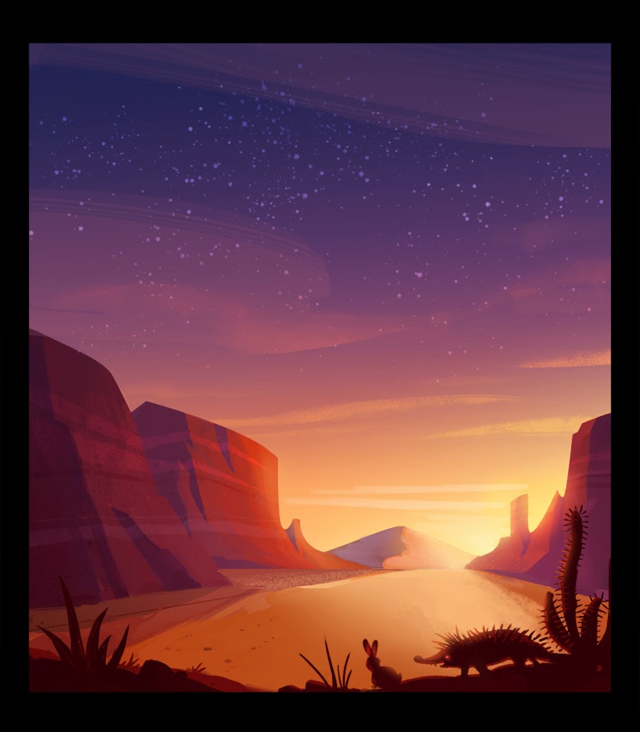 I was shooting for that classic, old Warner Bros vibe. I also borrowed heavily from the art style in Home on the Range (Disney).